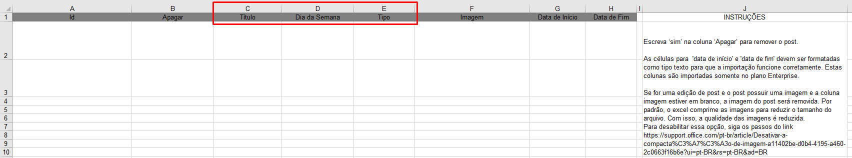 Repare que apenas os nomes dos cabeçalhos foram alterados para dar a entender que os conteúdos que vão ser inseridos à partir da linha 2 representam um tipo de assunto diferente do outro.