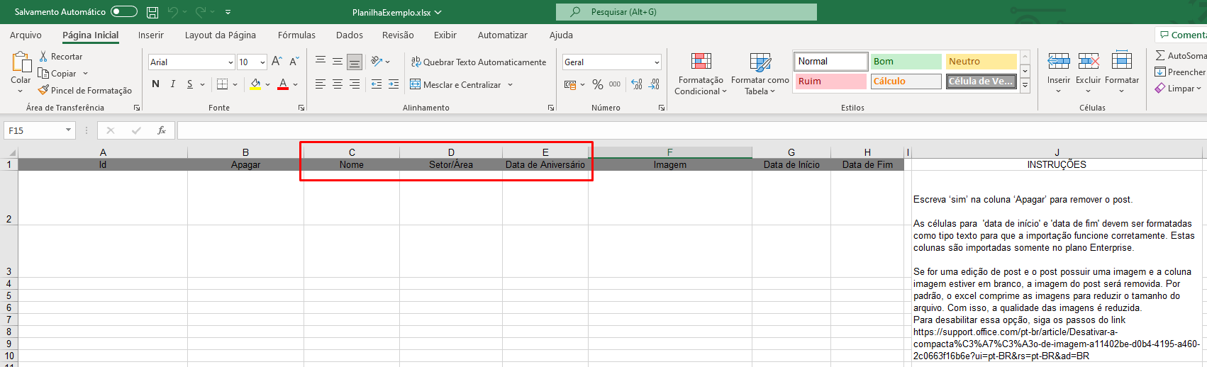 Supondo que para aniversariantes temos "Nome", "Área/Setor" e "Data de Aniversário", cada um destes elementos nós vamos usar um dos campos da planilha para importação dos dados.