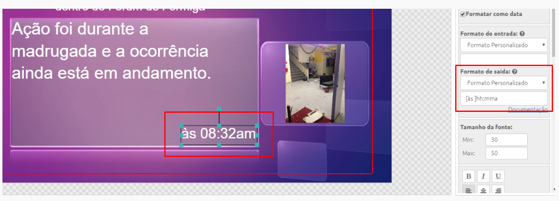Neste exemplo, mostraremos apenas a hora em formato americano utilizando o formato “[às ]hh:mma”: