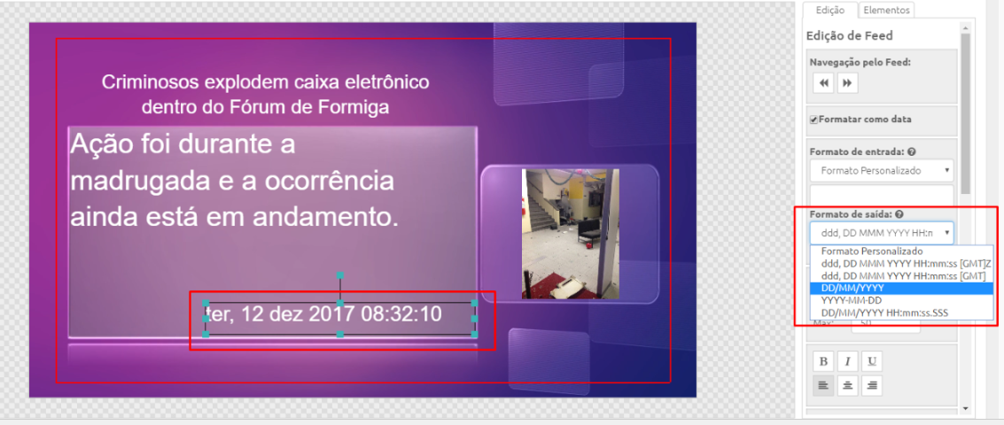 A partir da versão 2.9.0 do Manager é possível alterar o formato das datas provenientes de Fontes de Dados dentro do Creative. Cada feed RSS vem com um formato de data diferente, sendo assim a nossa equipe desenvolveu uma ferramenta que permite que a data seja padronizada conforme a sua necessidade.