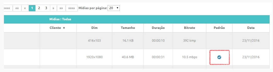 Ao terminar o Upload de seu vídeo, ele será exibido em sua biblioteca de Mídias com um círculo de progresso na coluna “Padrão”: