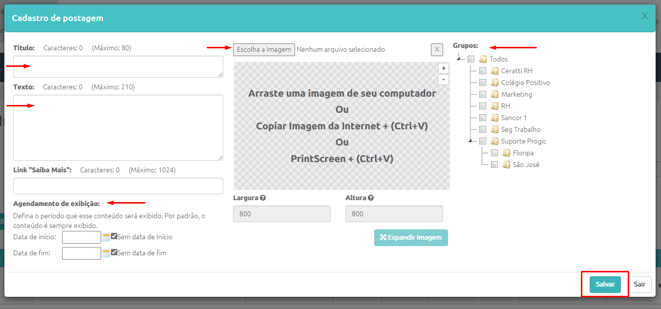 Selecione também o Grupo que terá acesso para visualizar as postagens dos Aniversariantes.