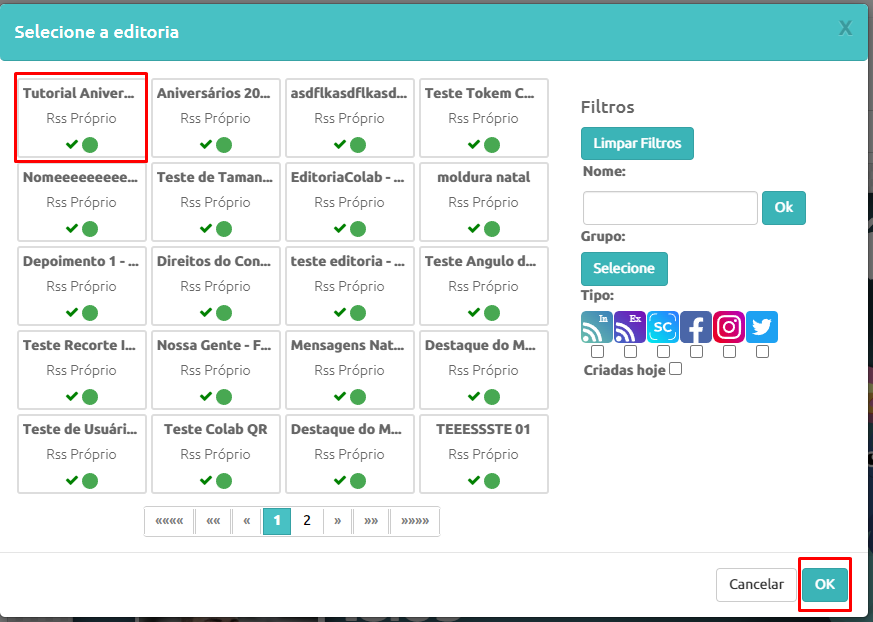 Ao confirmar no botão OK, as informações da Editoria de exemplo da Progic serão substituídas pelas informações da Editoria de Aniversariantes que você criou!
