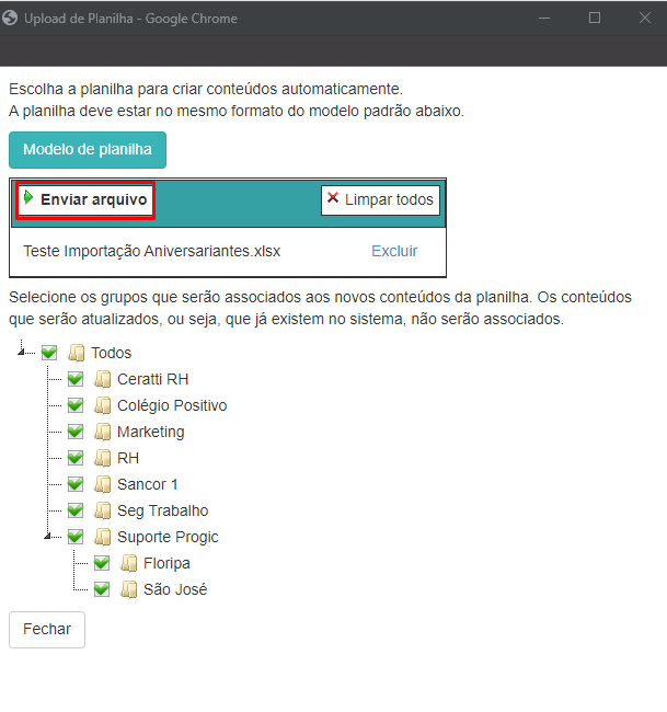 8° passo – Importe a Planilha – Agora que já Editou e Salvou a planilha faça a importação dela no Manager. Na página de edição da Editoria, selecione a opção “Importar”, “+Arquivo”, selecione a planilha, selecione os Grupos que terão acesso ao conteúdo da Editoria e em seguida “Enviar Arquivo”.