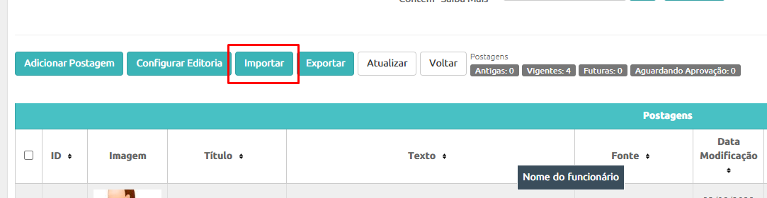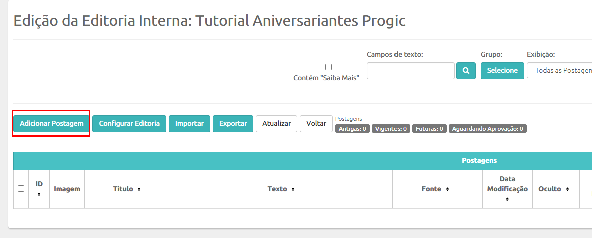 Depois de clicar em “Salvar”, você estará na tela “Edição da Editoria Interna”. Nela, é possível “Adicionar Postagem” para cadastrar os aniversariantes. Cada conteúdo adicionado nesta Editoria corresponde à um aniversariante.