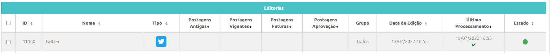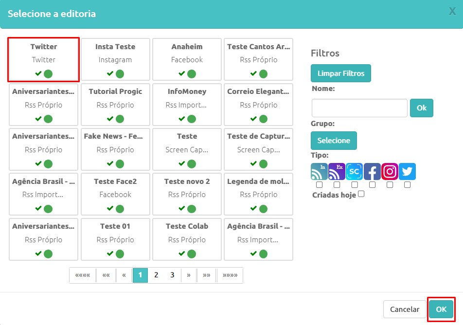 Uma nova tela se abrirá “Selecione a Editoria”. Dentre todas as Editorias disponíveis na sua conta, selecione a Editoria criada para o template do Twitter e confirme a alteração no botão OK.