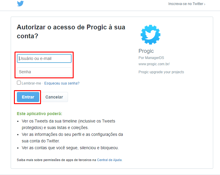 Uma nova janela será aberta para inserir Login e Senha de acesso à uma conta no Twitter.