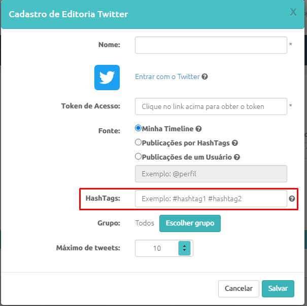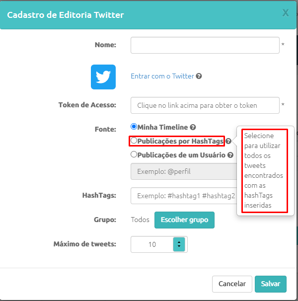 A opção “Publicações por Hashtags” te permite selecionar publicações em toda a rede do Twitter, de acordo com a hashtag escolhida. Só funciona uma hashtag por Editoria. Um exemplo de uso dessa funcionalidade te permite usar a hashtag para alguma ação específica com seus colaboradores ou clientes, para que os tweets deles apareçam na tela.