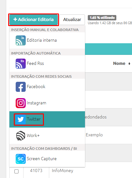 Para criar uma fonte de dados do Twitter, vá no menu “Conteúdos”, “Editorias”, “+Adicionar Editoria” e “Twitter”. Uma janela irá abrir na tela.