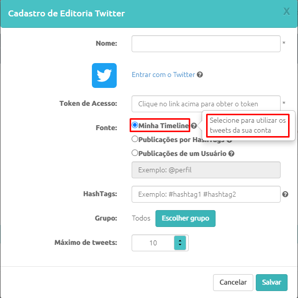 Importante! Só é possível incluir publicações desde que você entre com uma conta do Twitter fornecendo Usuário e Senha.