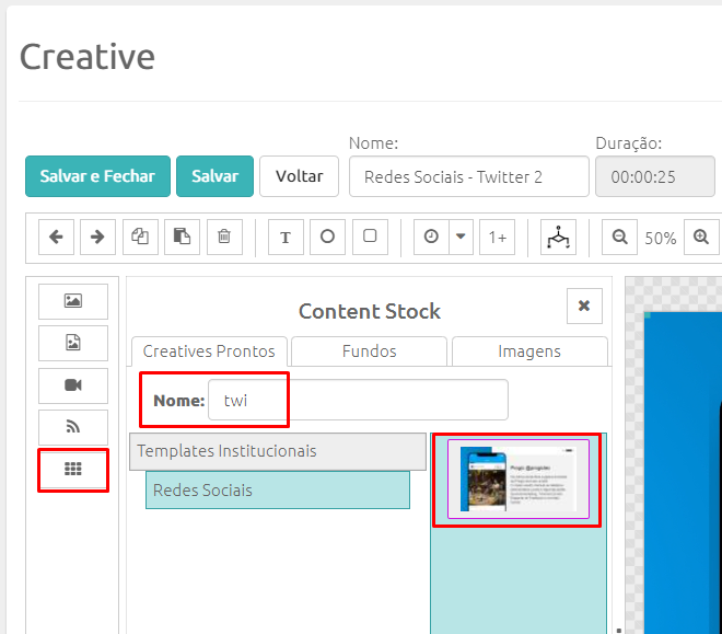 Para isso acesse “Conteúdos”, “Mídias”, “Creative”, clique no botão do “Content Stock” e escolha “Twitter” no campo para procurar os templates.