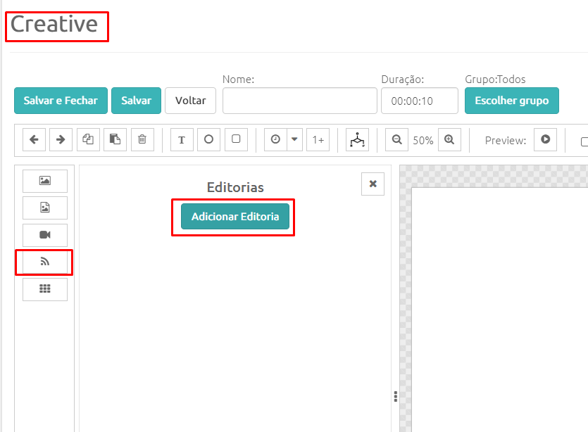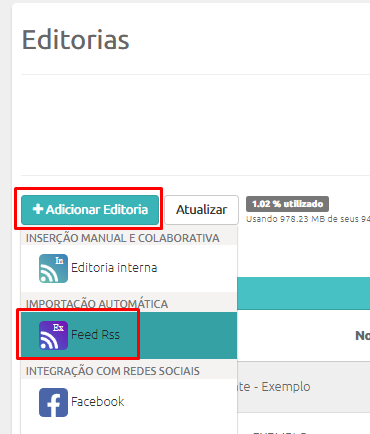 1º – Clique em +Adicionar Editoria -> Feed RSS