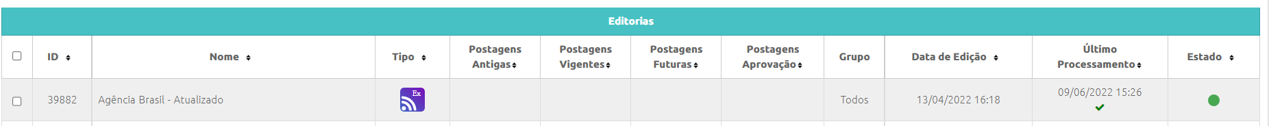 A tabela de conteúdos exibe as últimas publicações do Rss, onde são exibidas as seguintes informações: