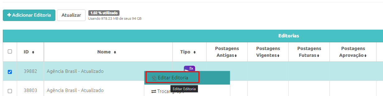 5º – Você ainda poderá ver as noticias do RSS, selecionando o RSS e clicando em Editar Editoria.