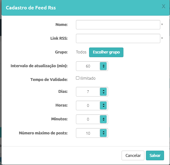 - Intervalo de atualização(min): Tempo em minutos que será verificado se o RSS possui alguma atualização.