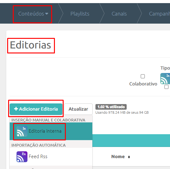 Vá em “Conteúdos”, “Editorias”, “+ Adicionar Editoria” e “Editoria Interna”.