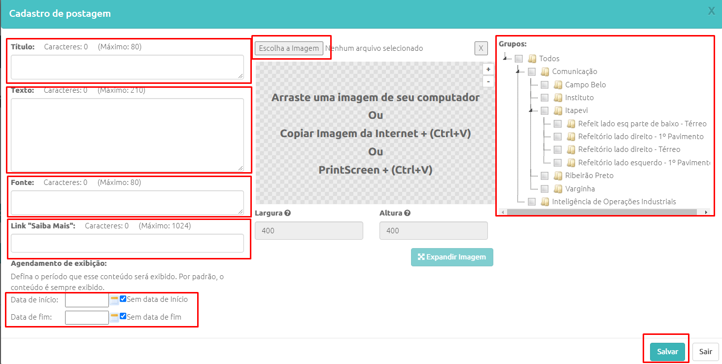 Grupos: Selecione os Grupos em que será exibida essa postagem (se você não usa essa configuração é só deixar selecionado Todos)