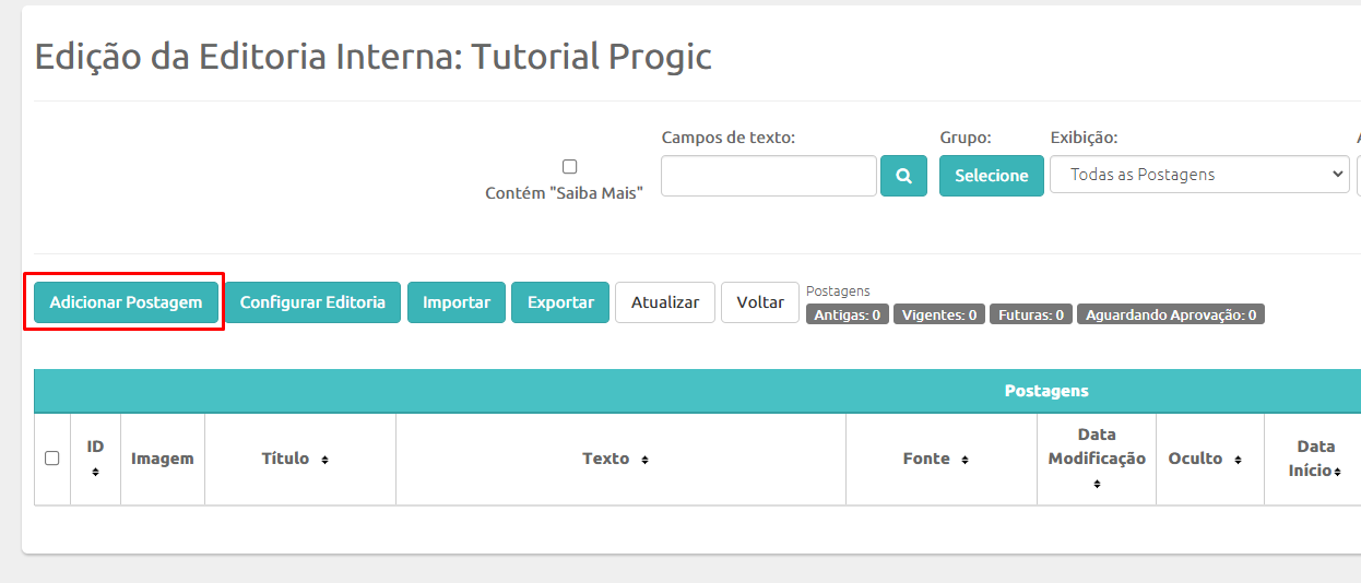 Na tela de Edição de Editoria, adicione as “notícias”, para isso vá em “Adicionar Postagem” e preencha o titulo, texto, fonte e imagem da notícia: