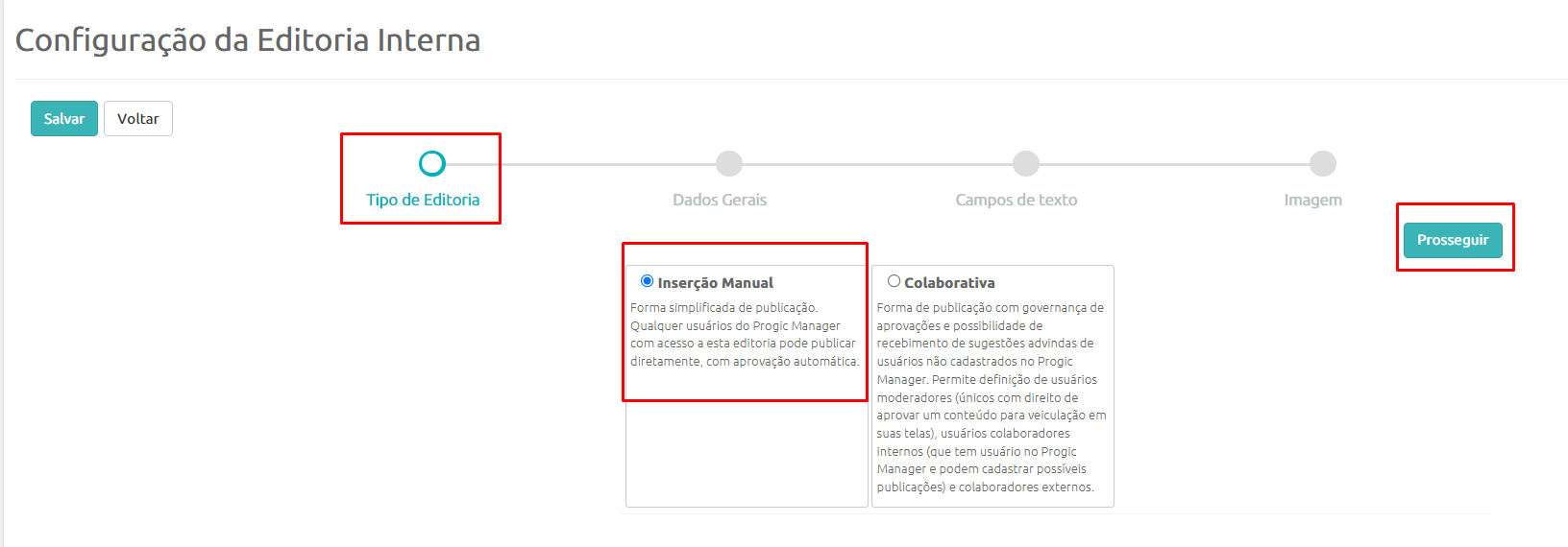 Em Tipo de Editoria (como estamos vendo a Editoria comum) então você deve selecionar o tipo Inserção Manual.