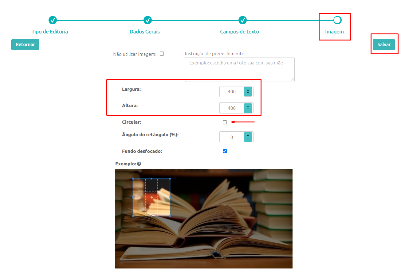 Na etapa a seguir (Imagem) você irá configurar o tamanho que a imagem irá ocupar no template, por padrão esse campo vem pré configurado em 400x400 pixels. Você pode alterar os campos de Largura e Altura conforme o layout do seu template para ficar mais adequado.