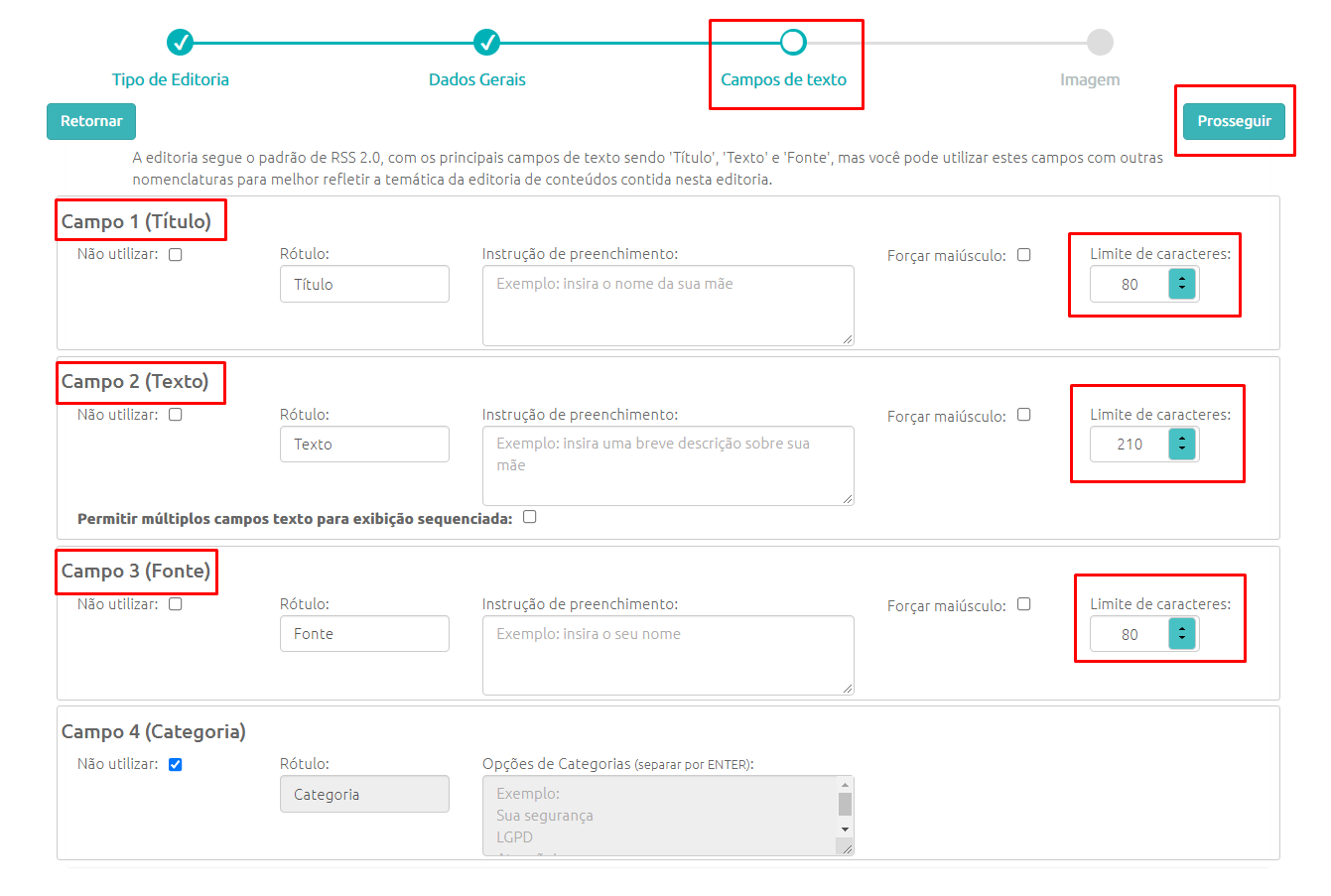 Em Campos de Texto você poderá quais campos de texto estarão disponíveis para serem exibidos no template, como também o limite de caracteres de cada um desses campos.