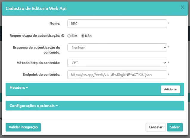 - Campo "Endpoint do conteúdo" - Deve ser colocado o Endpoint (link/url) da API, esse é o endereço que retorna o conteúdo em formato de JSON.