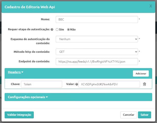 Campo “Configurações Opcionais” - Outros campos padrões de editorias - Nome, Grupo, Intervalo de atualização (seria de quanto em quanto tempo o dado será atualizado);