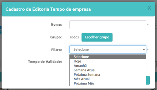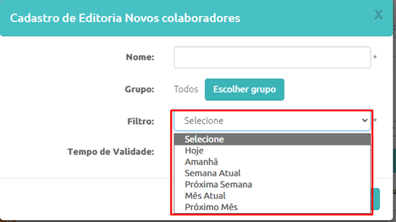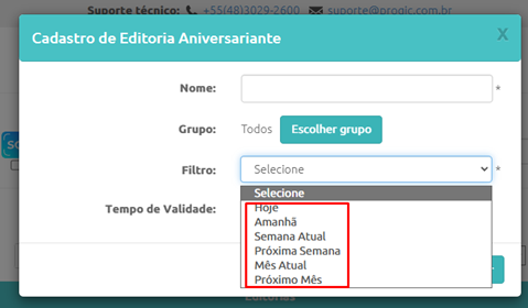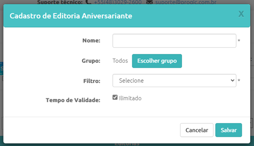Preencha o nome da Editoria que ficará salva na em sua conta, selecione a segmentação dos Grupos e o mais importante, selecione o tipo de filtro que será utilizado para exibir os dados dos aniversariantes: