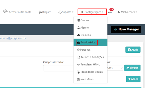 Para acessar a tela de Cadastro de Funcionários, acesse o Menu Superior em Configurações na opção Funcionários.