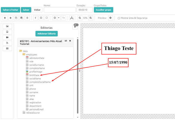 Todas as informações dos Aniversariantes serão atualizadas automaticamente no Template conforme os dados que estiverem cadastrados na tela de Funcionários.