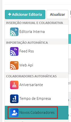 Por fim, agora falaremos sobre como realizar a configuração da Editoria de Novos Colaboradores. Para realizar esta configuração, acesse a opção Conteúdos > Editorias. Na tela de Editorias, clique no botão +Editoria e selecione a opção NOVOS COLABORADORES.
