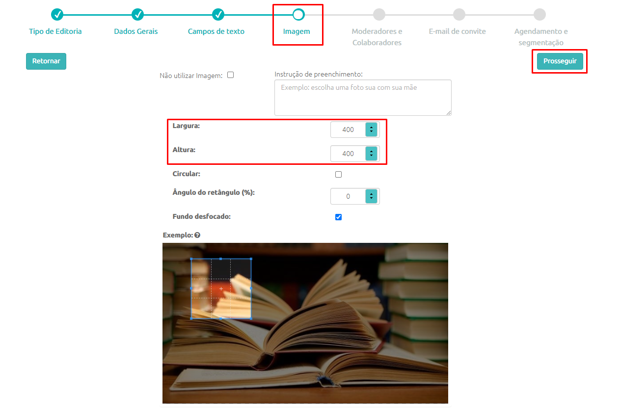 - Na etapa de configuração da Imagem da Editoria Colaborativa você poderá configurar o tamanho da imagem que poderá ser usada no Template: