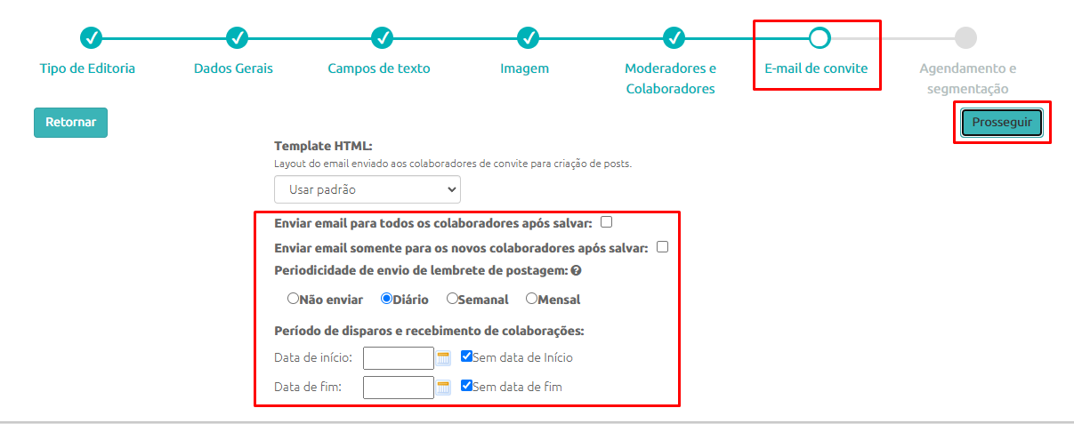 - E no campo Período de disparos e recebimento de colaborações você pode configurar um período fixo (Data de Início e Data de Fim) para serem enviados os e-mails de lembrete como também o prazo para o envio de conteúdos pelos colaboradores.