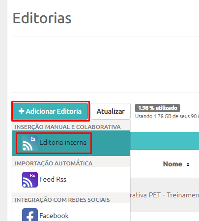 - Na aba de Editorias clique no botão +Adicionar Editoria e selecione a opção Editoria Interna;