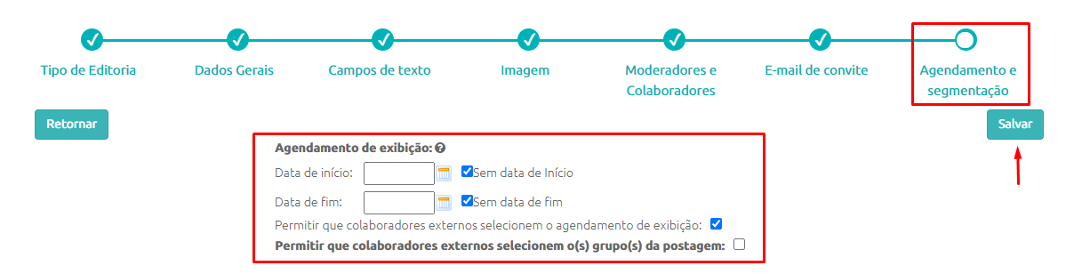 - Nesta etapa de configuração, em Agendamento e Segmentação, iremos finalizar as configurações da Editoria Colaborativa.