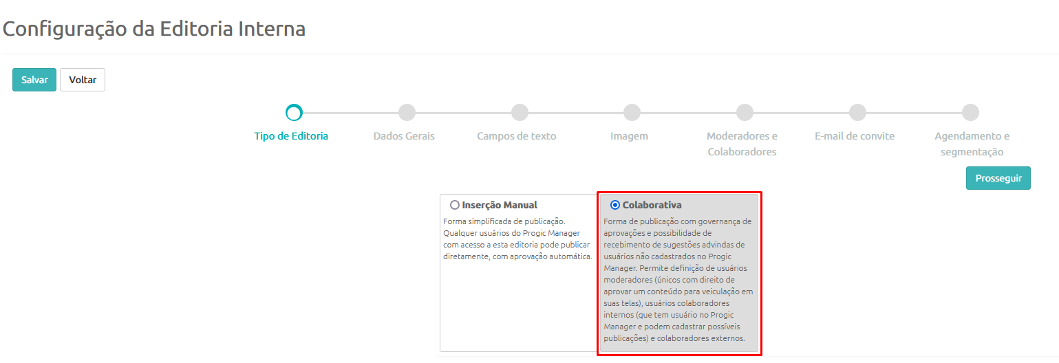 - Na tela de Configuração da Editoria Interna, a primeira etapa é selecionar o Tipo de Editoria Colaborativa e clique no botão Prosseguir;