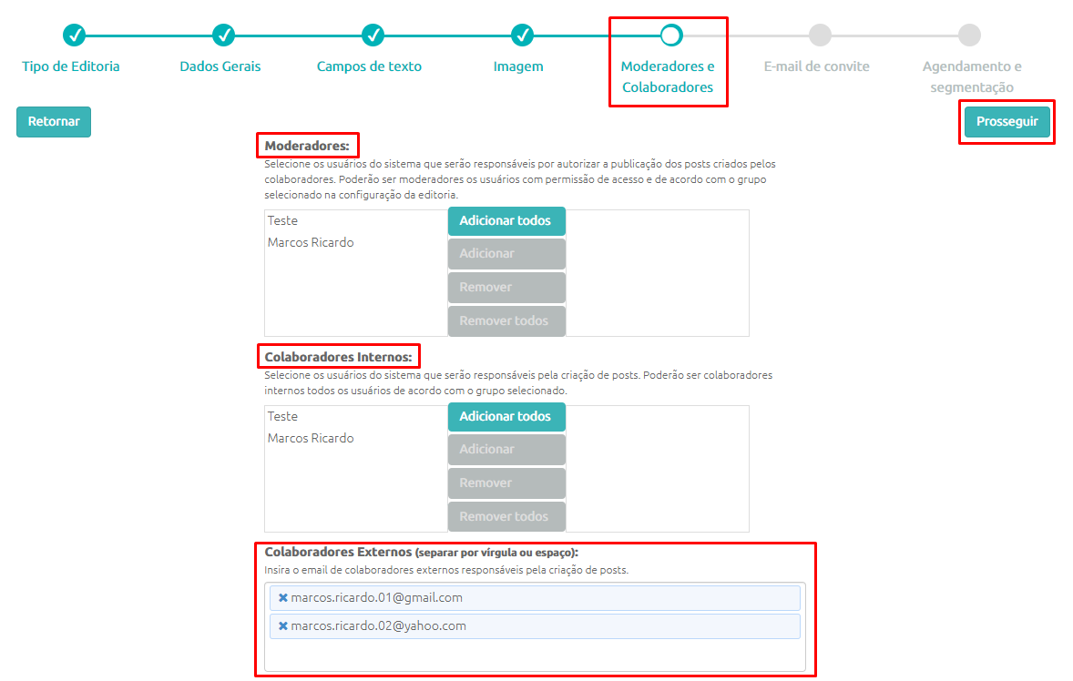 - Em Colaboradores Externos você deverá cadastrar a lista com todos os e-mails das pessoas que irão receber o e-mail para o envio de conteúdos para a Editoria;