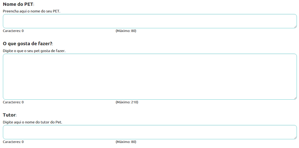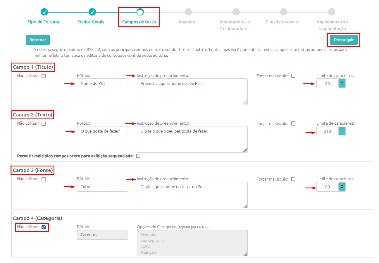 - Na etapa de Campos de texto iremos efetuar a configuração dos campos que serão preenchíveis pelos colaboradores com as devidas instruções para não termos erros nos conteúdos enviados: