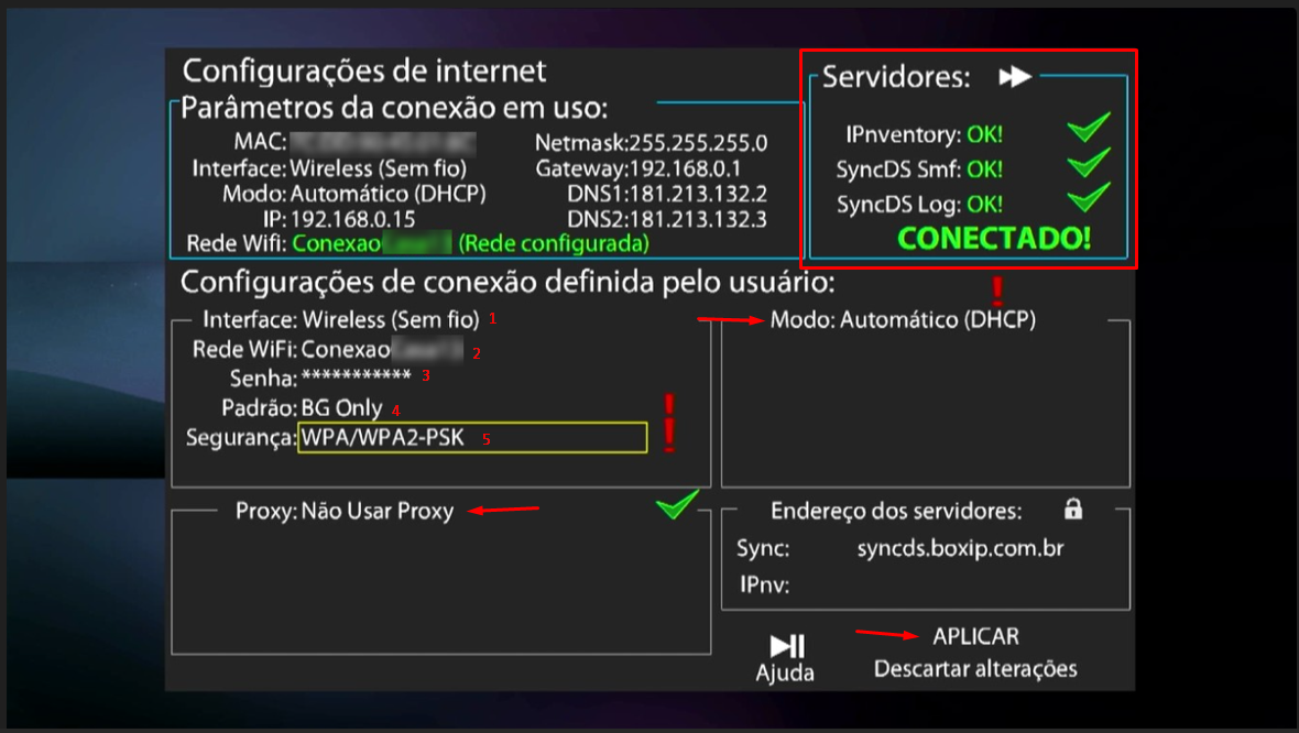 Após validar todas as configurações, navegue com as teclas direcionais do controle remoto até a opção APLICAR, clique nela com o botão OK/Select e aguarde o Progic Player validar todos os itens.