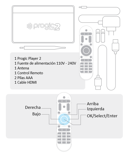 El Progic Player 2 se compone de los siguientes materiales que vienen con el equipo: