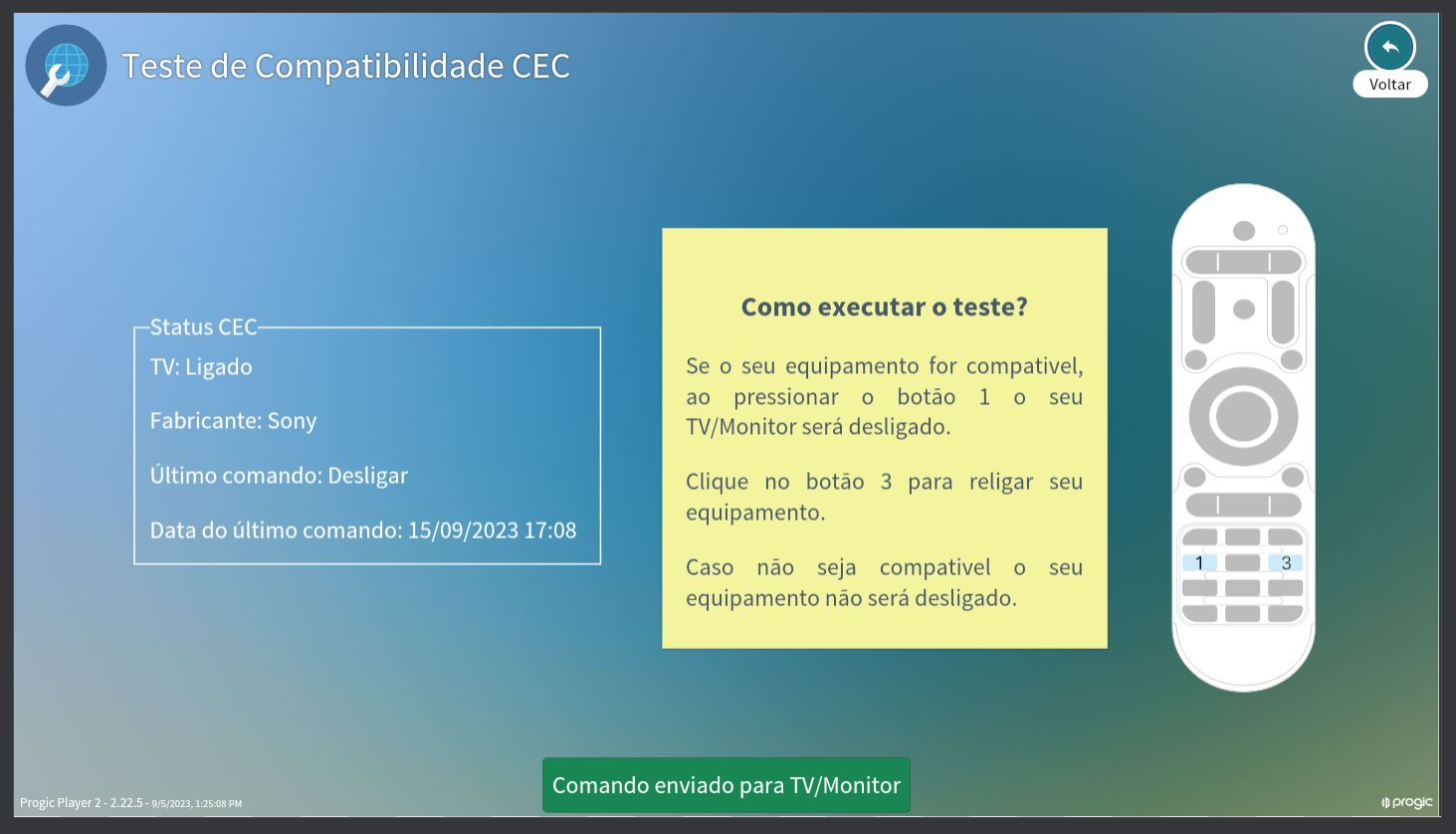 Pensando em garantir o melhor aproveitamento deste recurso e facilitar o mapeamento da compatibilidade para uso do protocolo CEC entre o Progic Player 2 e as TVs/Monitores, disponibilizamos diretamente nas configurações do Player a possibilidade de realizar um Teste de Compatibilidade CEC que poderá ajudar a entender se este recurso está disponível para a Tela que está conectada ao player e até mesmo se este recurso, além de disponível, já está ativo e pronto para o uso.