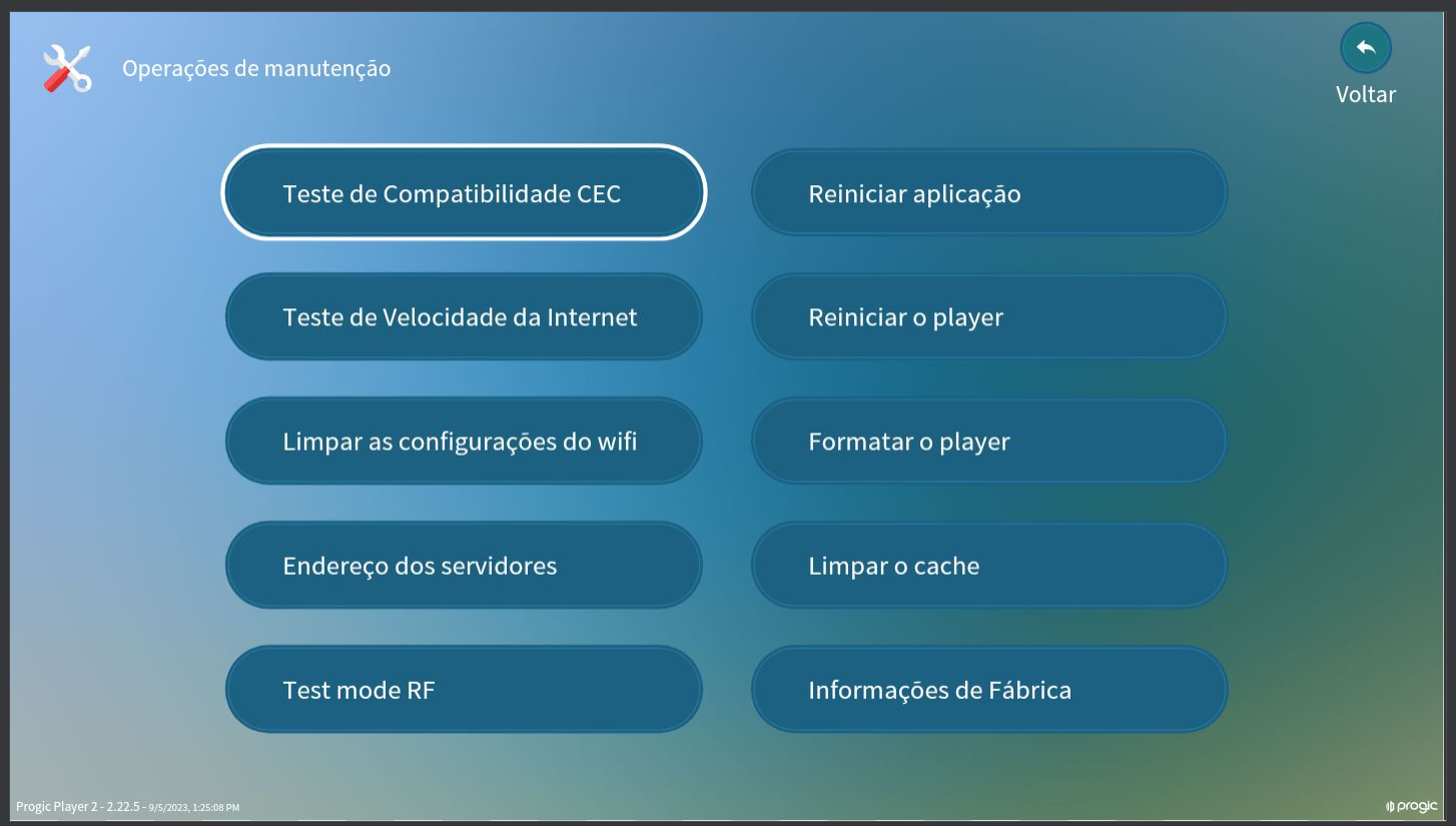 Caso o seu Progic Player 2 não possua o menu de Teste de Compatibilidade CEC, entre em contato o Suporte Técnico da Progic, nos canais: