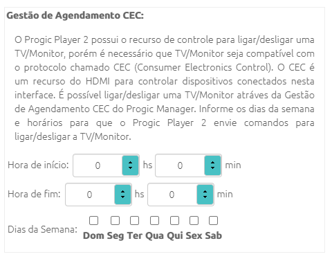 O Progic Player 2 possui o recurso de controle para ligar/desligar uma TV/Monitor, porém é necessário que TV/Monitor seja compatível com o protocolo chamado CEC (Consumer Electronics Control). O CEC é um recurso do HDMI para controlar dispositivos conectados nesta interface. É possível ligar/desligar uma TV/Monitor através da Gestão de Agendamento CEC do Progic Manager. Informe os dias da semana e horários para que o Progic Player 2 envie comandos para ligar/desligar a TV/Monitor.