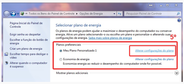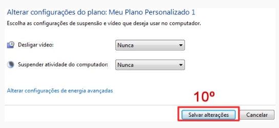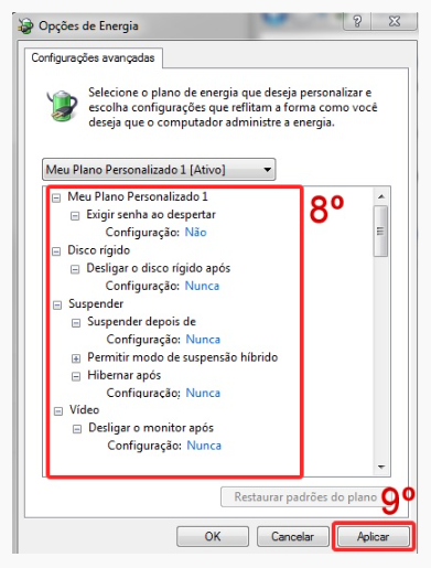 8º – Nas opções de energia avançadas é importante verificar as seguintes opções;