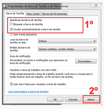 1º – Desabilite a opção “Bloquear a barra de tarefas” e habilite a opção “Ocultar automaticamente a barra de tarefas”