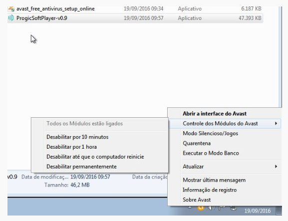 1- Para evitar problemas com o Antivírus clique com o botão direito em cima do símbolo do seu Antivírus ao lado do relógio e desabilite durante a instalação.
