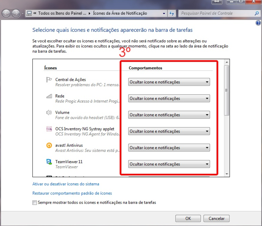 3º – Na coluna Comportamentos, selecione a opção Ocultar ícone e notificações para todas as aplicações.