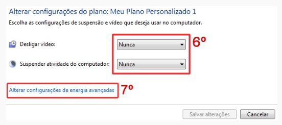 6º – Selecione a opção Nunca tanto na configuração Desligar vídeo quanto em Suspender atividade do computador, clique ;