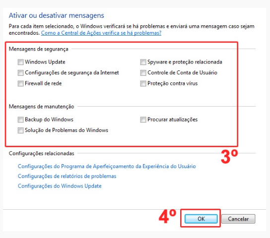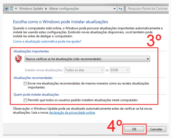 3º – Selecione a opção “Nunca verificar se há atualizações” e desmarque as opções de envio de atualizações e instalação de atualizações.