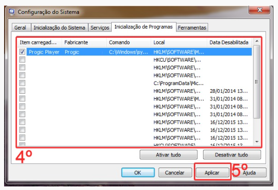 4º – Desativar todos os softwares de terceiros e deixar somente o software ProgicPC ativado. Caso você opte por manter algum programa na lista de inicialização automática, é possível que eles exibam mensagens e que interrompam a exibição da programação. Nesse caso recomendamos que configure esses programas para não exibir notificações.